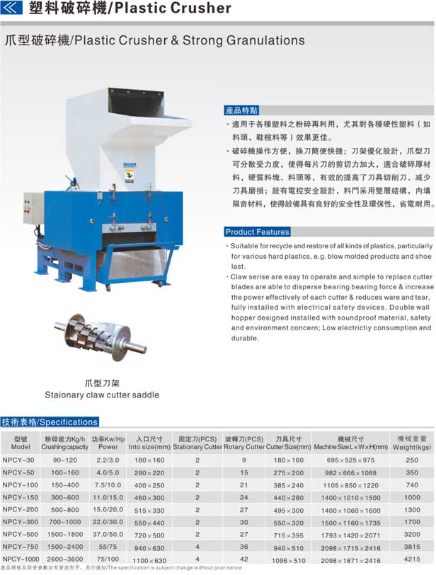 適用于各種逆料之粉碎再利用,尤其對各類硬性塑料(如料頭,鞋楦料等)效果更佳。NPCY系列破碎機(jī)操作方便,換刀簡便快捷;刀架優(yōu)化設(shè)計(jì),爪型刀可分散受力度,便得每片刀和剪切力加大,適合破碎厚材料,硬質(zhì)料塊,料頭等,有效的提高了刀具切削力,減少刀具磨損;設(shè)有電控按全設(shè)計(jì),料頭采用雙層結(jié)構(gòu),內(nèi)填隔音材料,使得設(shè)備具有良好的安全性及環(huán)保性,省電耐用。